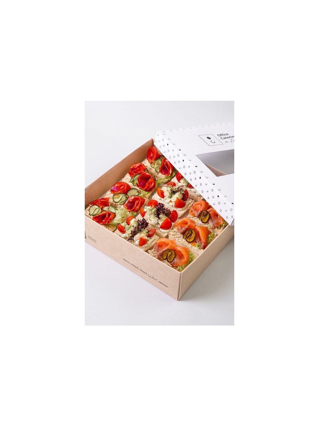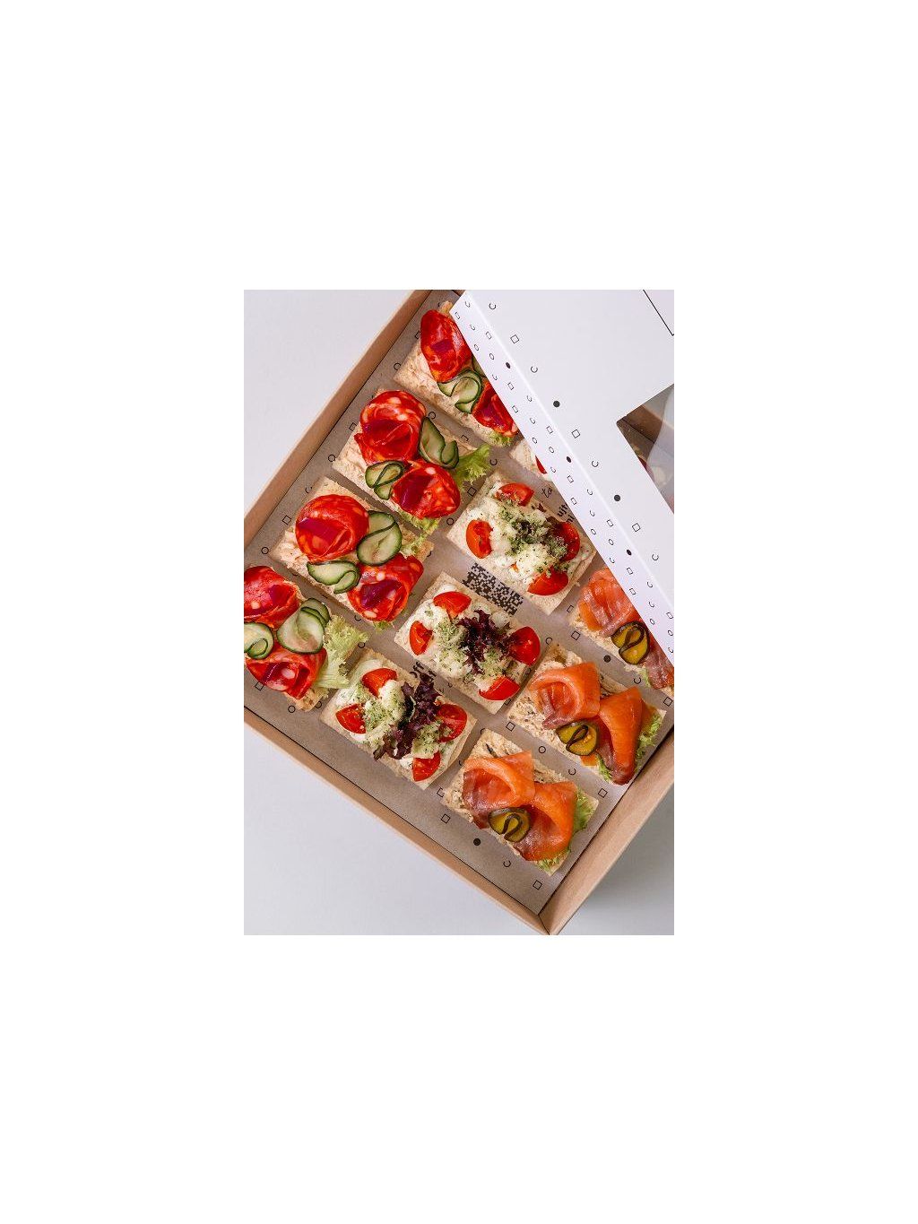 4x losos s marinovanou cuketou, 4x chorizo salám, 4x rajčata s mozzarellou VEG