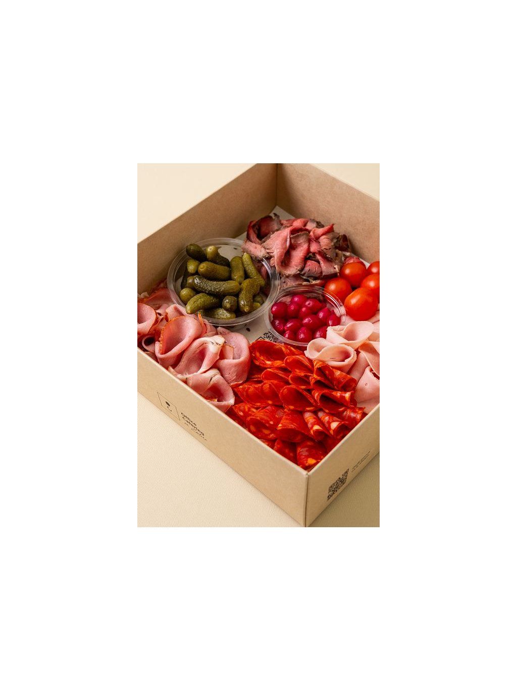 Složení: chorizo, moravské uzené, vepřová šunka, rostbíf, nakládané cibulky a okurky
